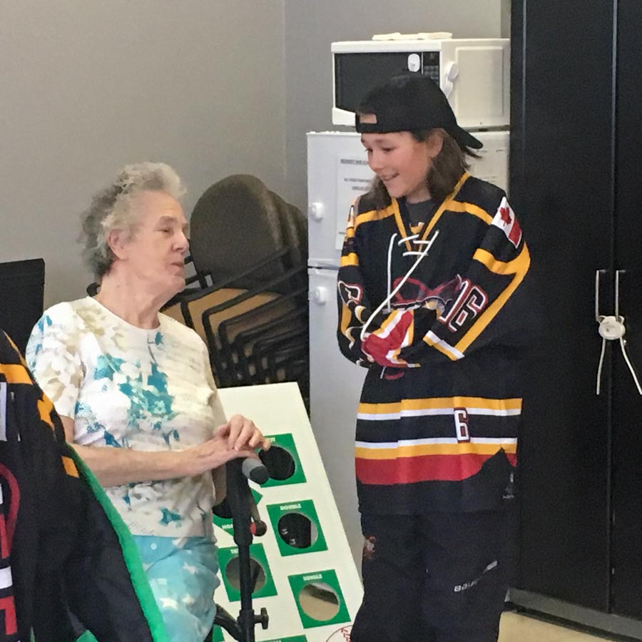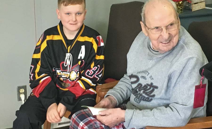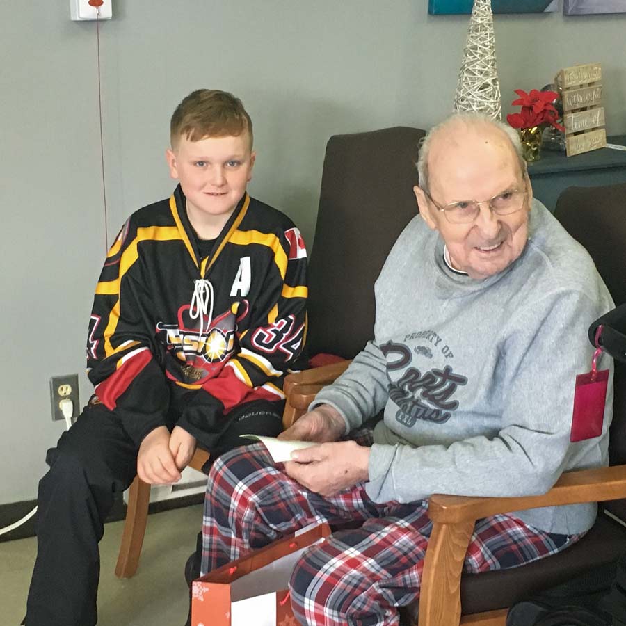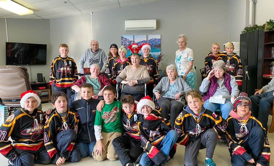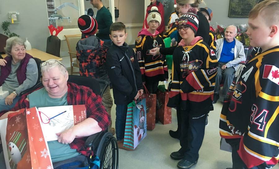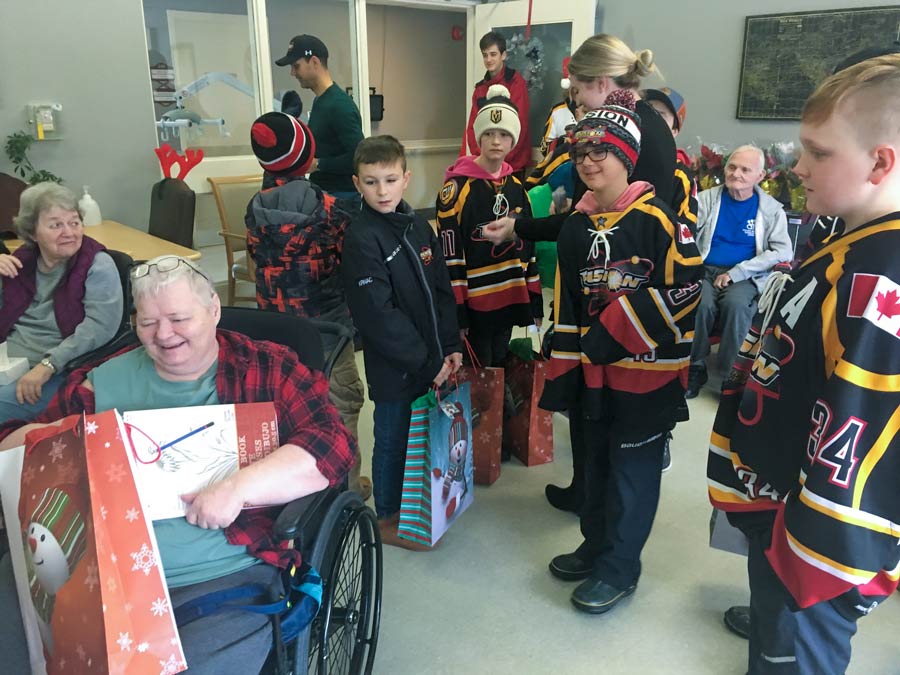 Giving – On Dec. 21, the Centre Wellington Fusion Minor Peewee AE team went to Caressant Care in Fergus to deliver Christmas gifts to residents in the nursing home.