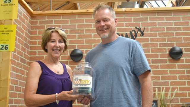 FERGUS – Mary-Ann Branciere, left, vice president of the Fergus and District Horticultural Society, presents Curt McQueen, manager of the Centre Wellington Food Bank, with a $1,029 cash donation thanks to the generosity of everyone attending this year’s Garden Tour on June 23. Branciere was the lead