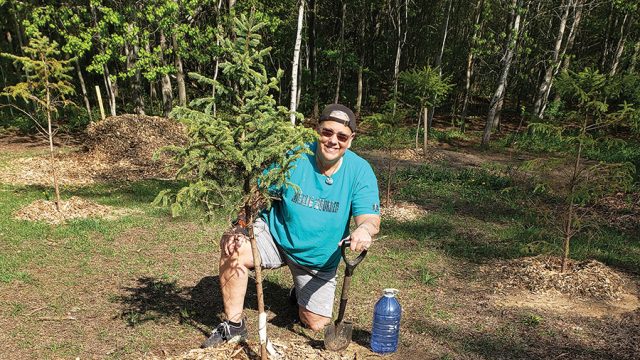 FERGUS – Volunteer Theresa Evan helps to plant trees at the Fergus Dog Park on May 12.