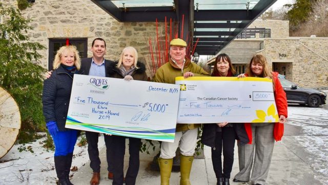 Cheque presentation - Elora Horse and Hound Parade organizers presented cheques for $5,000 to Groves Hospital Foundation and the Canadian Cancer Society on Dec. 11 outside the Elora Mill.