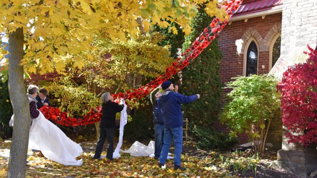 ELORA – St. John’s Anglican Church in Elora started making these banners with knitted and crocheted poppies a few years ago and now have fashioned several banners that hang throughout the village for Remembrance Day.