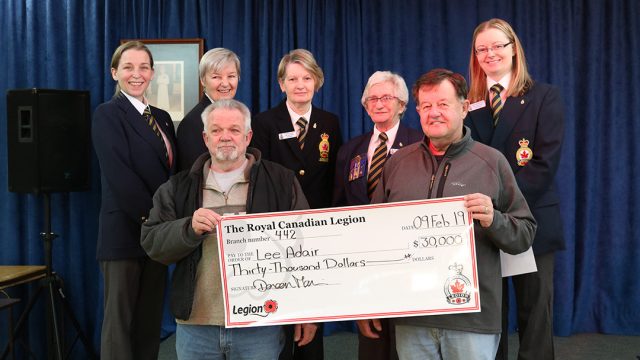 Lee Adair of Erin, at left, holds the $30,000 prize cheque from the Catch the Ace draw held by…