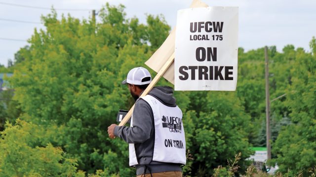 GUELPH – A striking worker walks along Watson Parkway on June 11 to join fellow workers on the picket line at Cargill’s beef processing facility on Dunlop Drive in Guelph.