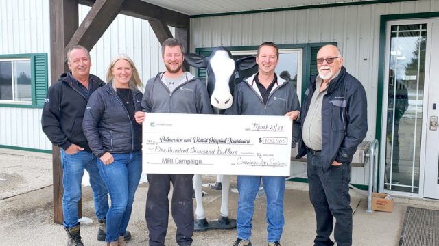 PALMERSTON - Palmerston and District Hospital Foundation President Earl Campbell was on hand recently to thank the Struyk family and Conestogo Agri Systems for their $100,000 pledge to the foundation’s MRI+ Campaign.