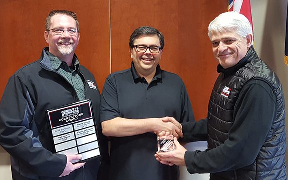 Crimes Stoppers Guelph Wellington vice chair Deryck West holds the Cornerstone Plaque, while 2018…