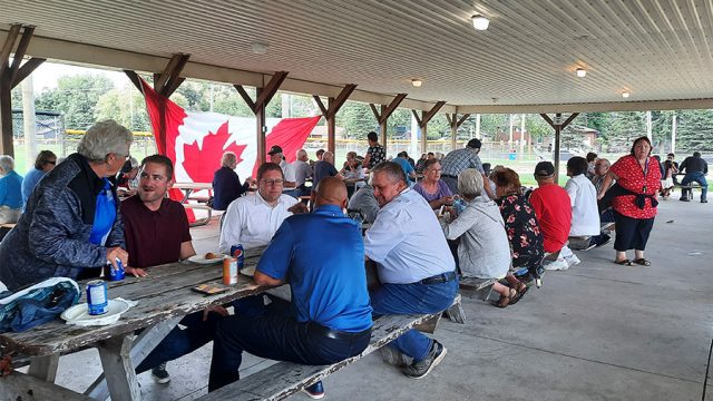 Thanks, Arthur – A large Canadian flag is seen hanging behind local politicians and community members at a “thank you” barbecue on Aug. 30 to show appreciation for everyone who made the Arthur 150th celebration and Canada Day weekend a resounding success.