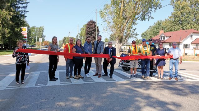 WELLINGTON NORTH – Standing in the centre of Arthur’s Smith Street on Sept. 19, Wellington North Mayor Andy Lennox cut the ribbon on a new crosswalk described as the first of its kind in the community.
