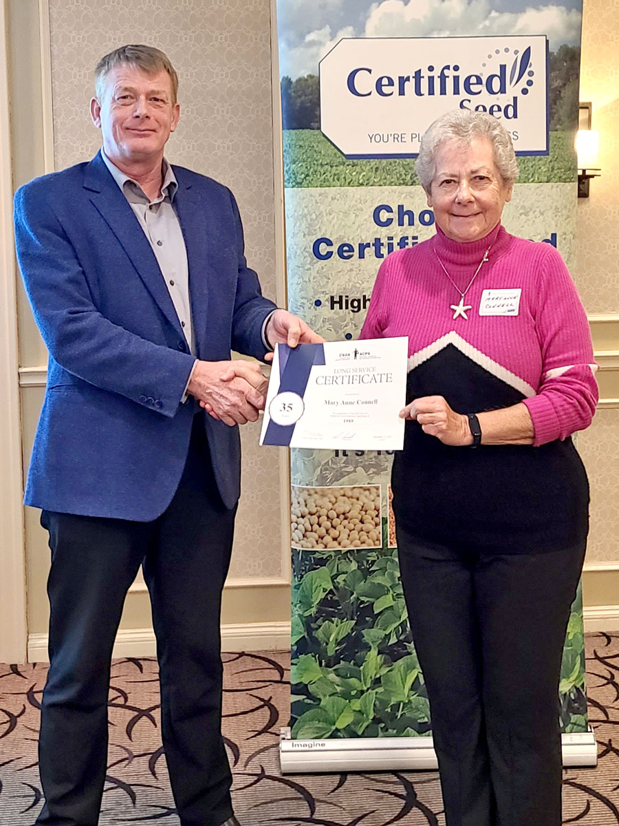 LONDON – Mary Anne Connell received a long service certificate in recognition of 35 successful years of pedigreed seed production on March 18 at the at the annual meeting of the Ontario Seed Growers’ Association in London. The Long Service Certificate is always presented by the president of the Canadian Seed Growers’ Association, who this year happens to be Mary Anne’s son, Dale Connell, who is serving a two-year term as president, which ends in June of 2024.
