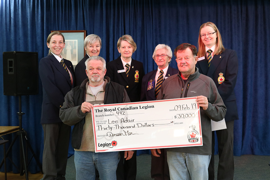 Lee Adair of Erin, at left, holds the $30,000 prize cheque from the Catch the Ace draw held by Royal Canadian Legion Branch 442 Erin. It was presented at a Feb. 9 awards day. Adair’s name was on the winning ticket, but the prize is being shared among a group of 11, including Phil Bludd on the right. In the back row, left to right, from the branch are Susanne Booth, Patty Booth, Verna Bludd, Rose Ostrander and Doreen Marier. Submitted photo