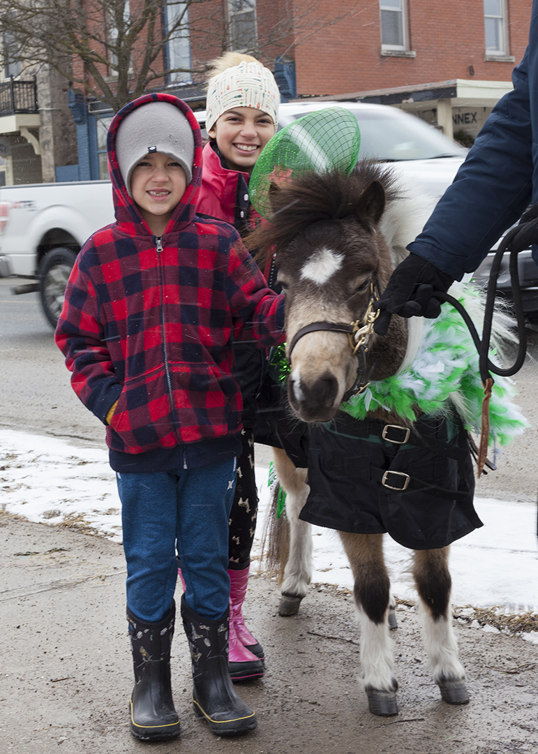 Kiera and Maverick Phillip from Mono were amazed to see a real-life “leprechaun horse” in downtown Erin last weekend. Visitors were in the village on March 16 and 17 for St. Patrick’s Day activities, in connection with the upside-down sale sponsored by the local BIA. Photo by Danielle Cargill