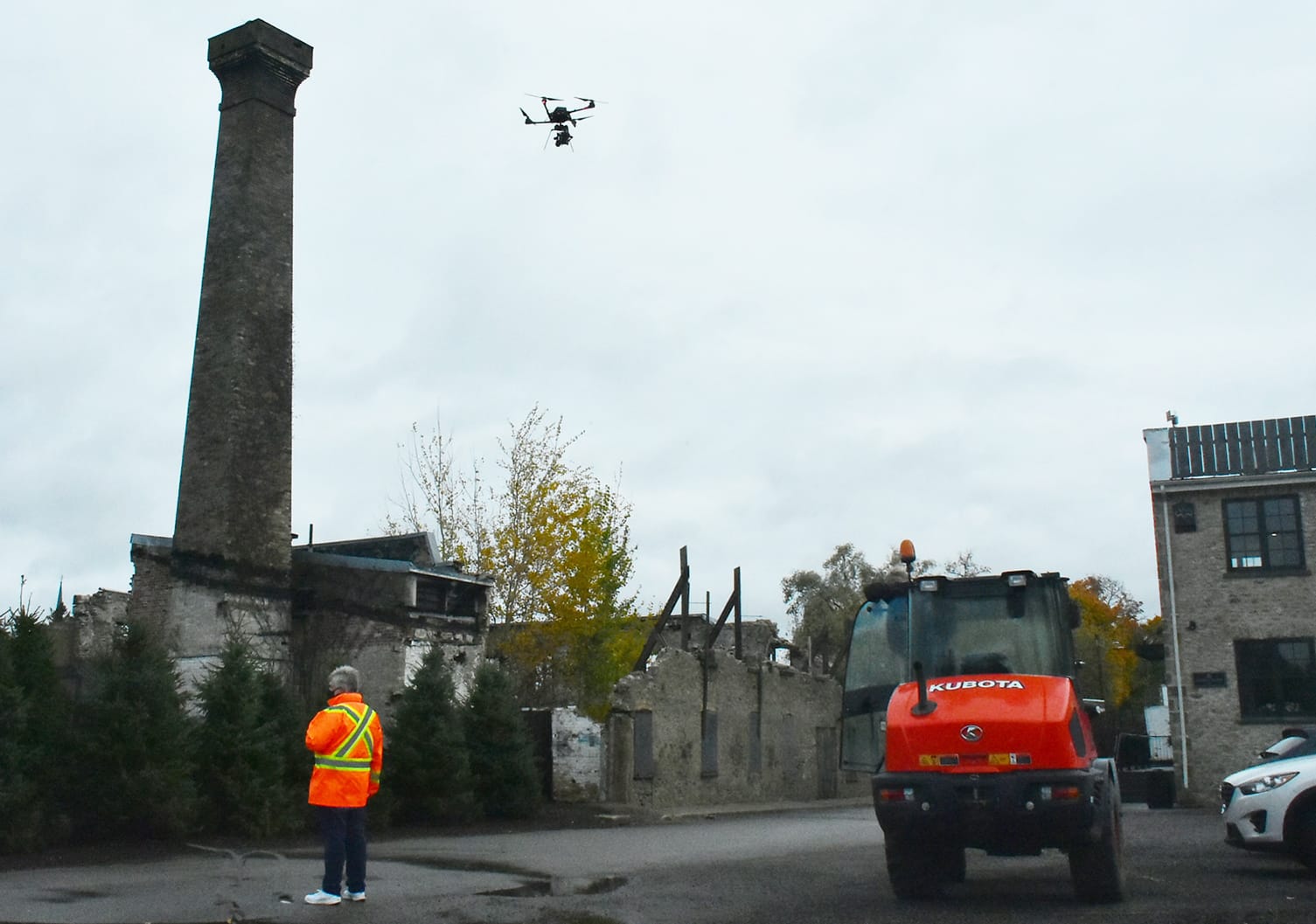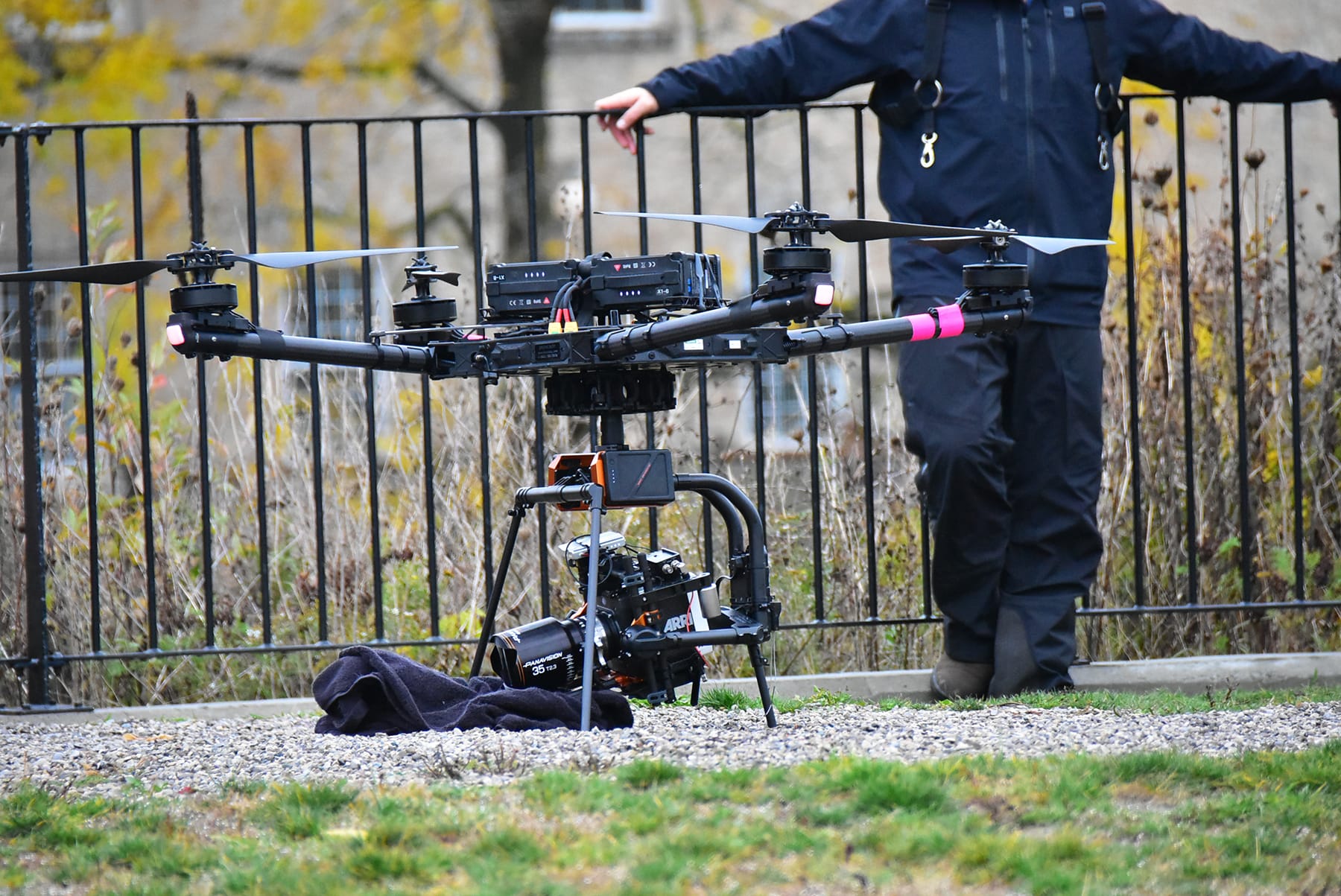On the morning of Oct. 21, traffic was stopped intermittently on Mill and Metcalfe streets, as well as on the Jack R. MacDonald pedestrian bridge, as a drone filmed a scene for the movie The Man from Toronto.