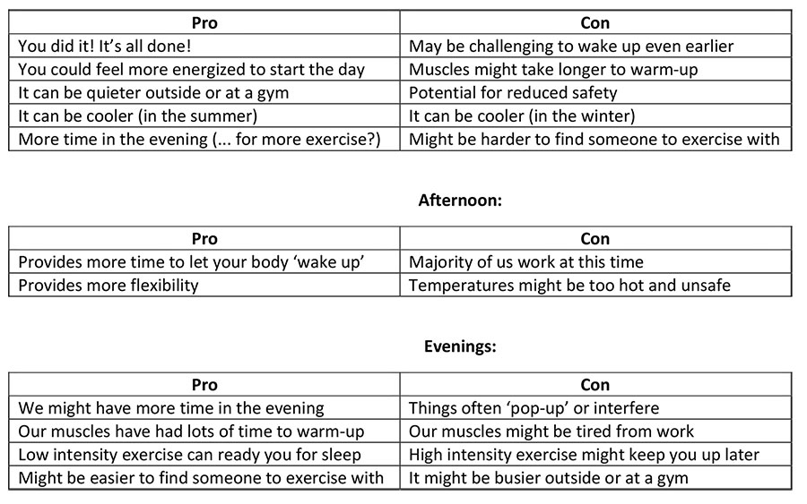 Ultimately, we need to allow for a ‘trial and error’ phase to see what works best. Usually to start, we are often asked, ‘What is the best time to exercise?’ or ‘What is the optimal time to exercise?’ This can be a very tricky question to answer! For all things related to health and exercise, we look to the research. But when it comes to the research on ‘Best time to exercise’, well, it’s still relatively inconclusive. As noted, there are so many factors that come into play here. Sometimes running through a Pro/Con list to figure out what might work best could be helpful. By no means is this a complete list, but here are some of the common considerations for exercise timing: