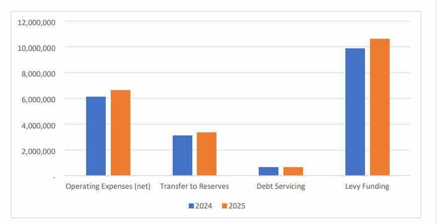The general levy requirement for Mapleton’s 2025 budget is $10.2 million – a combination of operating expenditures, transfer to reserves and long-term debt servicing, less nearly $380,000 generated by assessment growth.