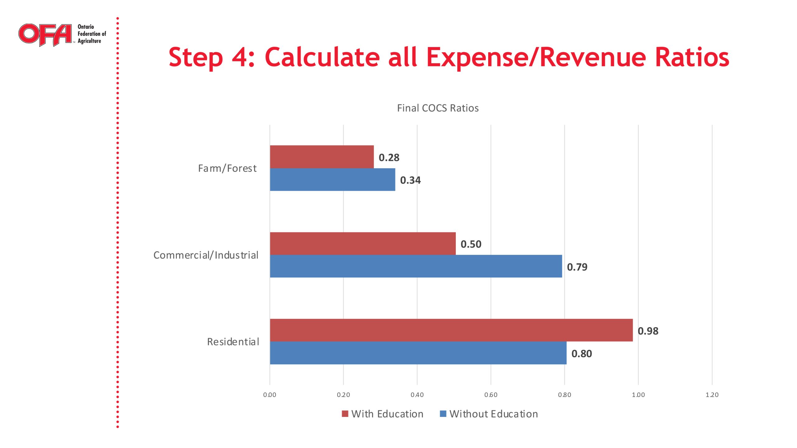When education taxes are included, the expense/revenue rate for farmland falls to 28 cents, compared to 50 cents for commercial and 98 cents for residential.