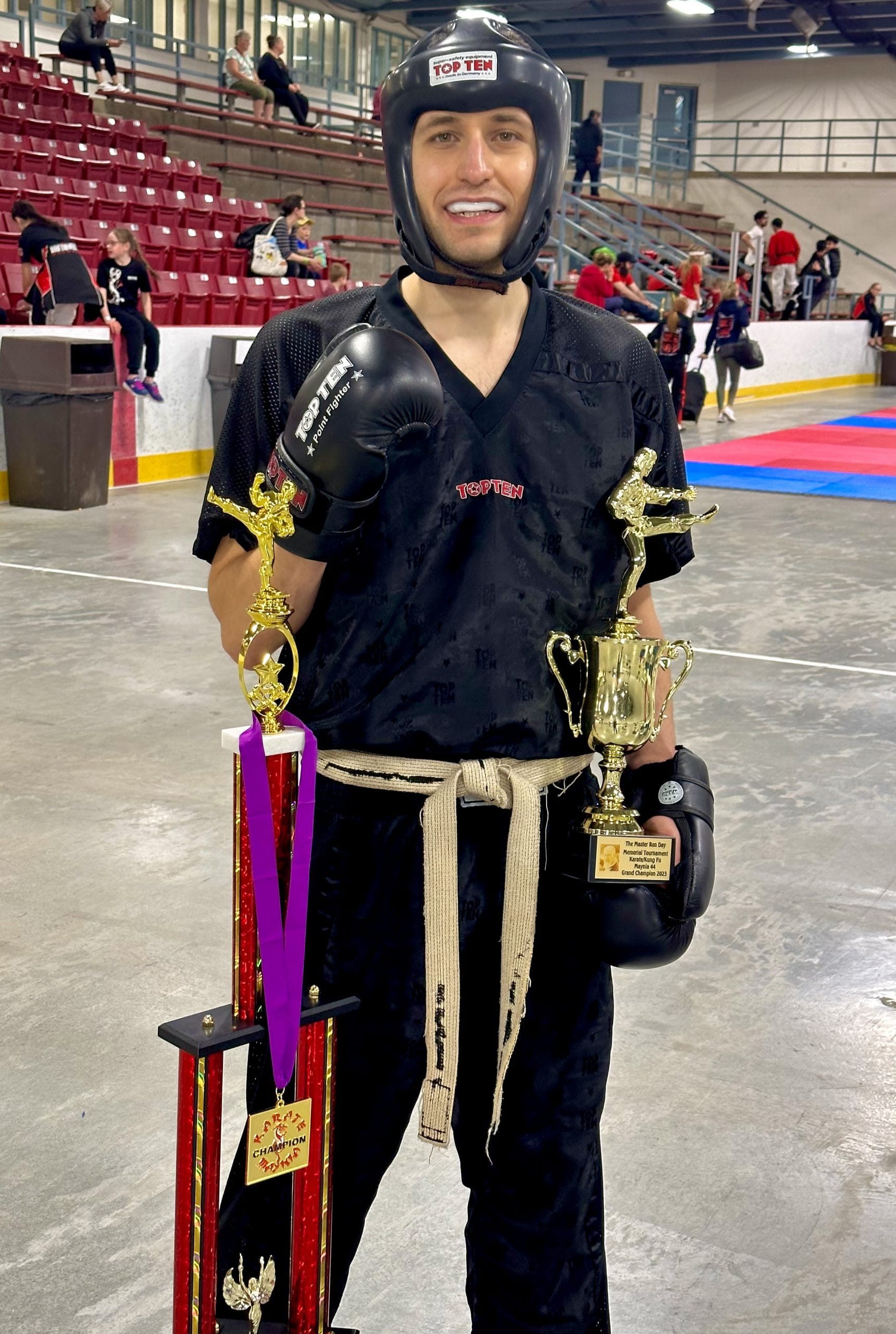 Local Martial Artist Nathan Skoufis, 29, claimed Gold in the Canadian Open Martial Arts Championships May 6-7 in Kitchener. Competitors were from throughout North America and martial arts stylist included Karate, Tae Kwon Do, Boxing, Kickboxing, Kung Fu and many more. Skoufis claimed 1st place in men’s adult fighting. The fighting winners are all brought together to compete for the Overall Grand Champion title, and Skoufis was crowned the overall champion. He has now won the title for the 10th straight year at the Canadian Open Championships.