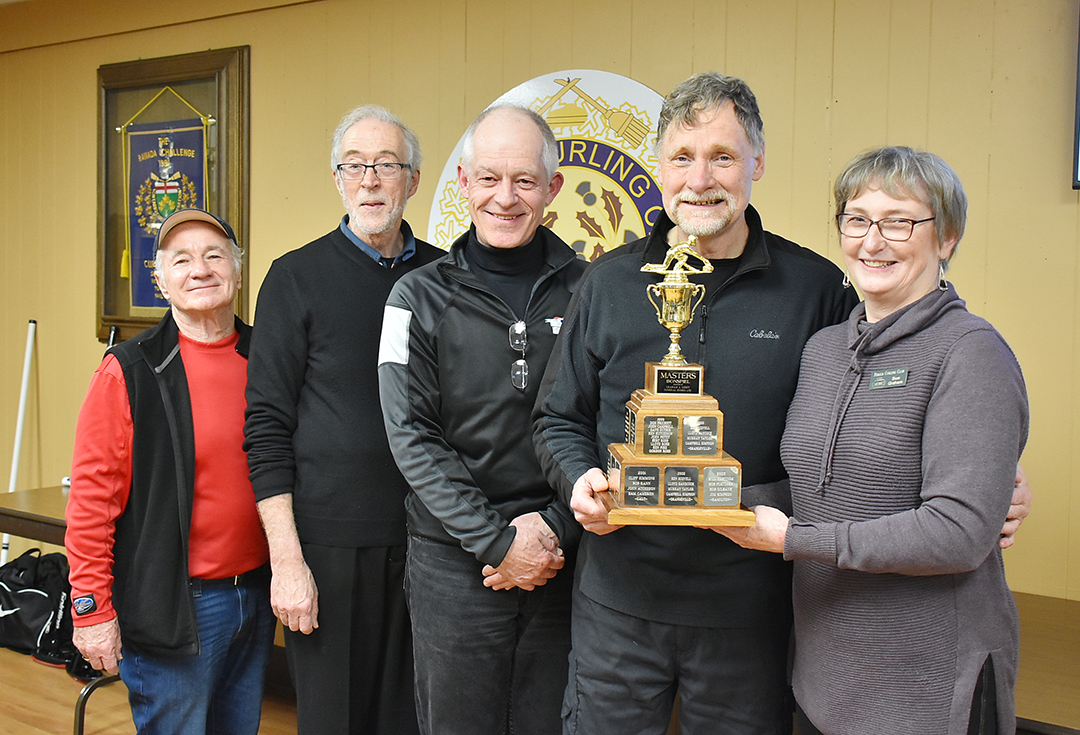 Despite poor road conditions, teams from Alliston, Listowel, Harriston, Arthur and Guelph came to curl at the Fergus Curling Club on Feb. 13 in the Masters bonspiel, competing for the Giddy Funeral Home Trophy. The Orangeville Curling Club, which had won this event in 2016, won again with 35 points. Left to right are: Dave Dyce lead, Peter Moore second, Mike Schultz vice-skip and Jim Henderson skip. Sue Graham on the right was the hostess for the day. Photo by Bill Longshaw