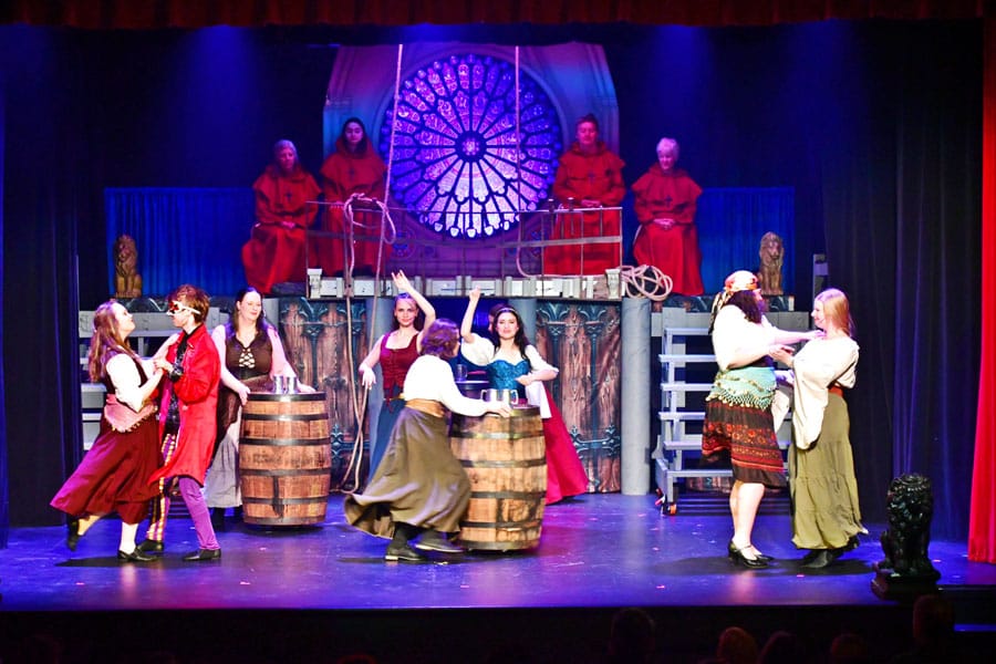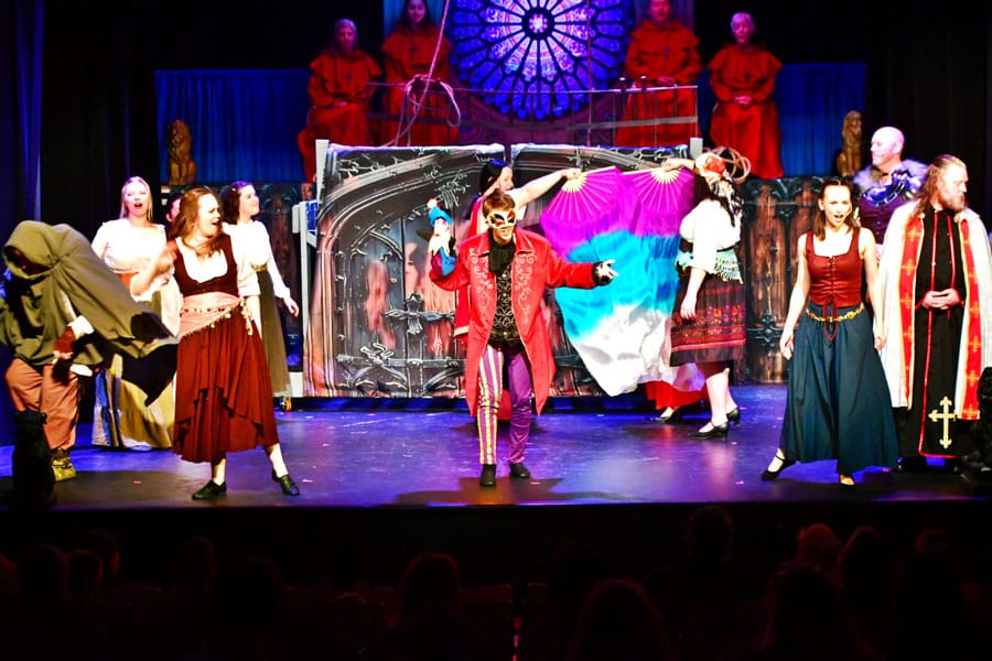 FERGUS – Mavis Productions staged five performances of the Hunchback of Notre Dame at the Fergus Grand Theatre last weekend. It proved to be great entertainment with dark themes about love, justice, prejudice and the influence of religion on everyday life. Here Quasimodo, who is in love with Romani Esmeralda, who is far beyond his station in life, talks with a pastor. There was singing and dancing along with some dark moments, in the play.