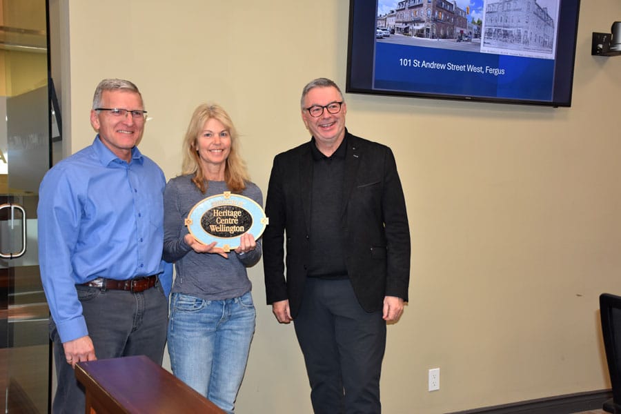 Dale and Lori Clarke received a plaque from Heritage Centre Wellington on April 8 in recognition of their property at 101 St. Andrew St. W. in Fergus receiving heritage designation. The property is a landmark in downtown Fergus and contains a cafe, commercial spaces and residential units above.