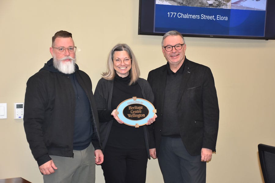 CENTRE WELLINGTON – Centre Wellington Mayor Shawn Watters distributed plaques signifying buildings with heritage designation during a Heritage Centre Wellington meeting on April 8.