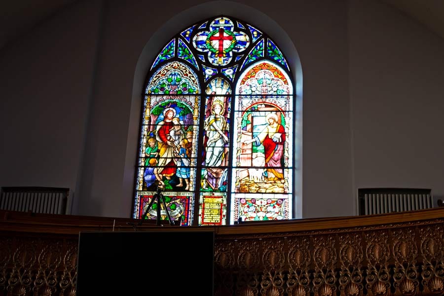 The congregation collected enough money to replace and repair the stained glass windows that dominate the sanctuary.