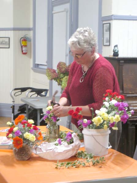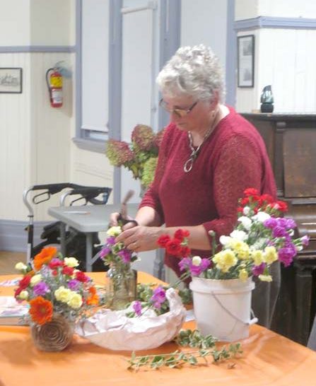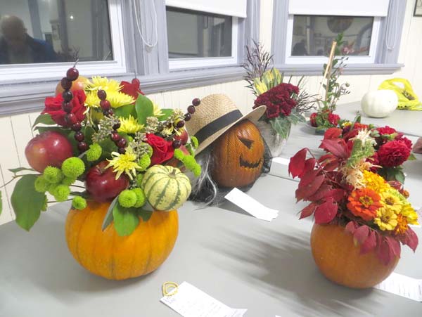 Mini show – The Harriston and District Horticultural Society met on Oct. 16. PHOTO ONE: Dorothy Noecker of Moorefield showed members how to arrange fall flowers. PHOTO TWO: The mini show featured plenty of colourful and imaginative arrangements. Sally Andrade won the People’s Choice award in the Decorate a Pumpkin category, and Dorelene Anderson won for her abstract design Outside the Box. Members were also able to trade seeds and fall bulbs, to be ready for next spring. Submitted photos