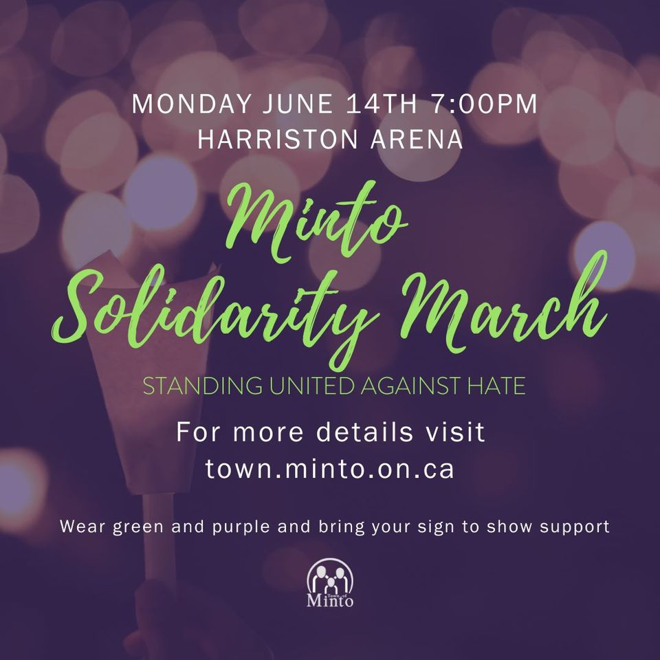 The “Solidarity March to stand united against hate,” organized by members of the Minto Cultural Roundtable and concerned citizens, will take place on June 14 at 7pm at the Harriston Arena ball diamond, at 111 George St. S.