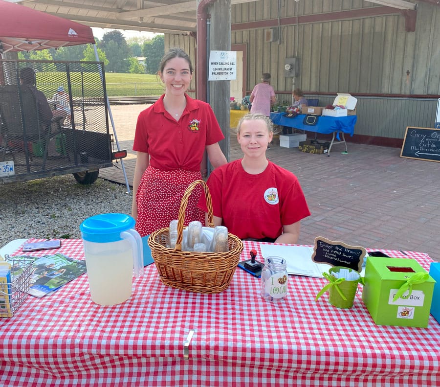 Town of Minto staff members Erin Raftis, left, and Ella Raynard passed out lemonade and helped visitors enter draws at the market.