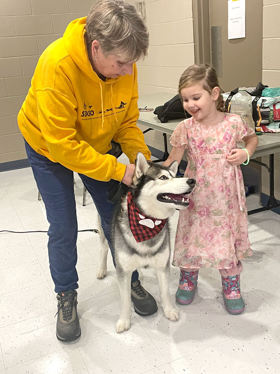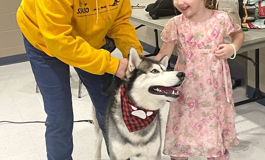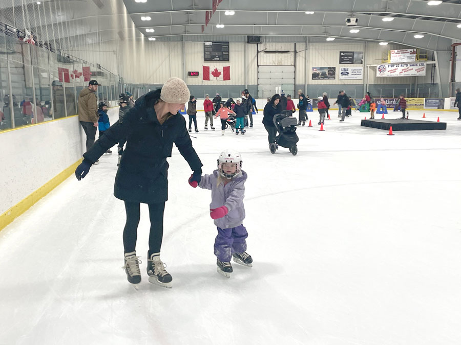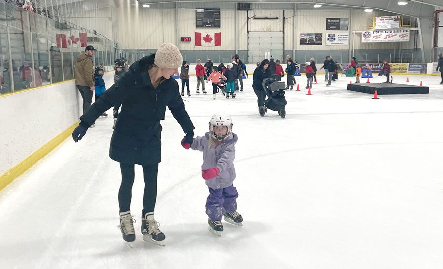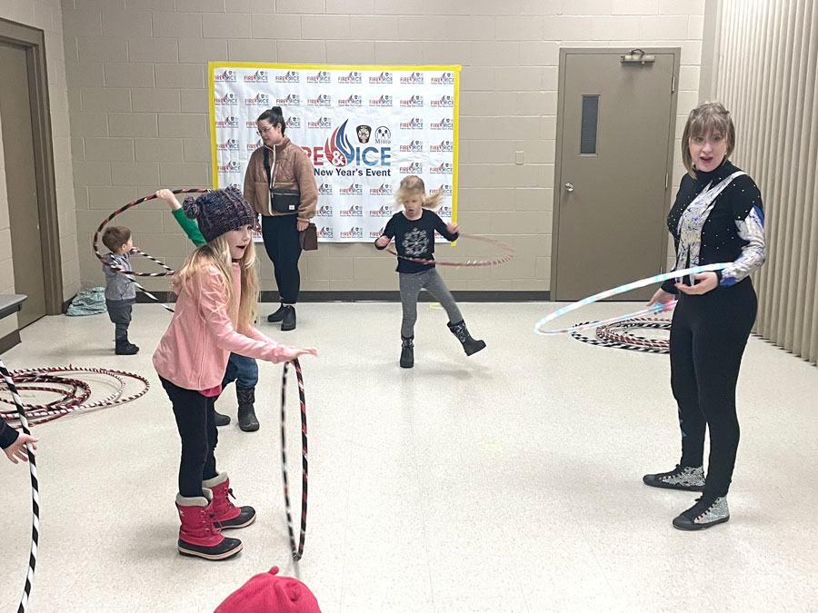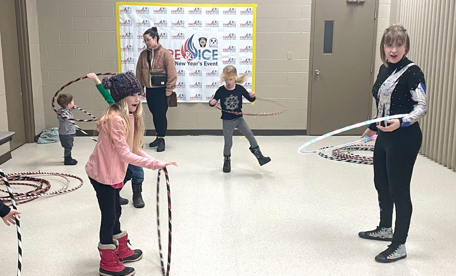 Bringing in the new year – The Fire and Ice New Year’s Eve party hosted by the Town of Minto and Minto firefighters drew a crowd of over 500 to the Palmerston arena on Dec. 31. Ice skating, a fire show, food booths and other activities were all part of the fun. A sled dog meet-and-greet was moved inside due to wet weather, but Peyton Martin was delighted to meet one of Deb Langois’ huskies all the same.