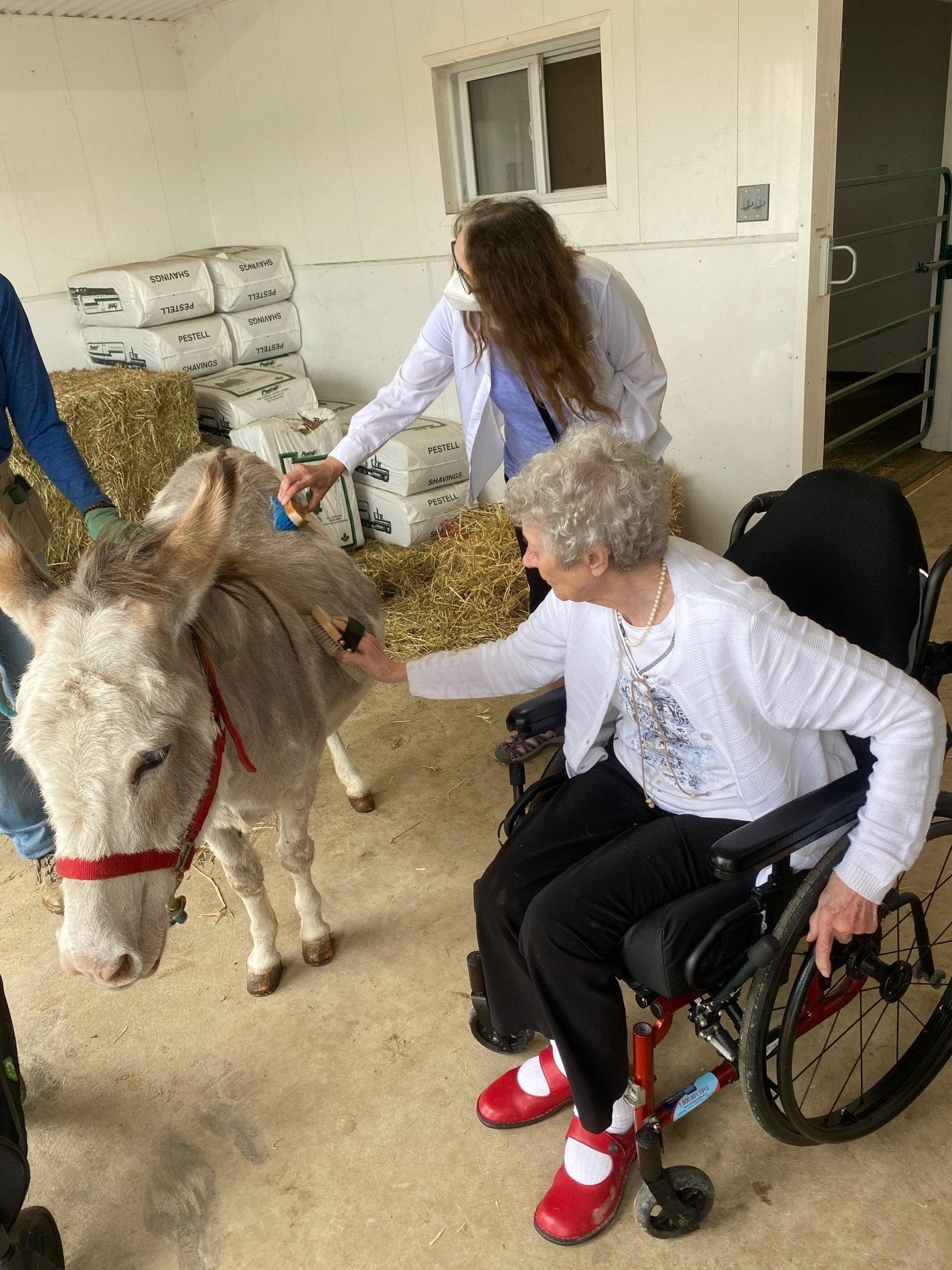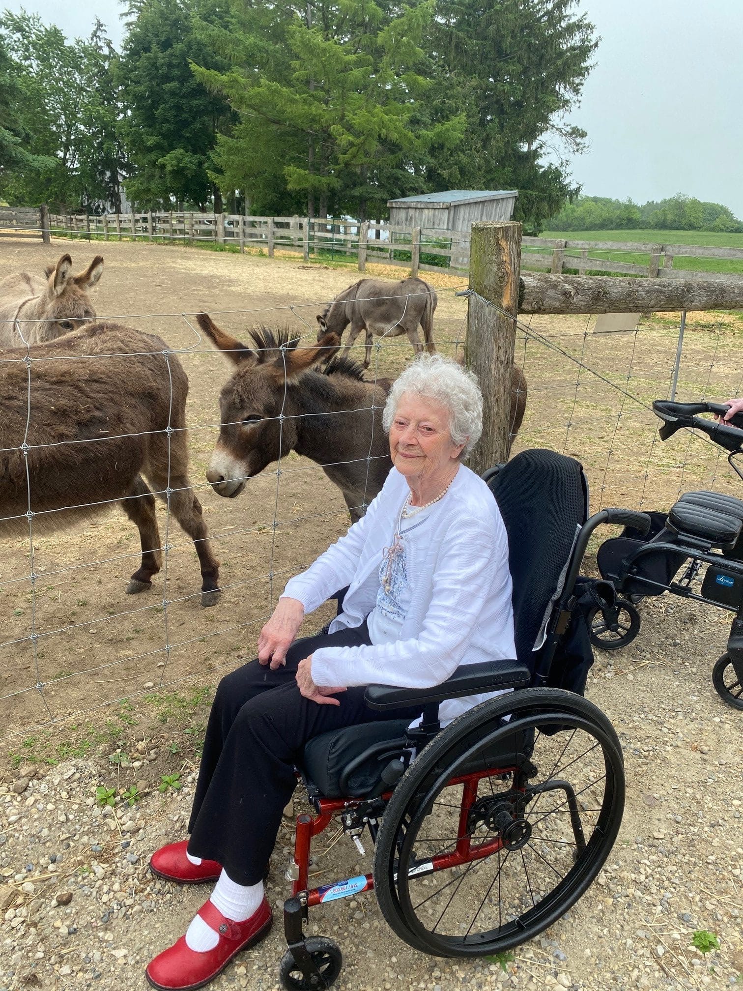 PUSLINCH – Doreen Mitchell celebrated her 100th birthday at the Donkey Sanctuary of Canada on June 23, the day before the Wellington Terrace resident turned 100. This was a part of the Wellington Wish Program that helps fulfil dreams and wishes for residents. The Donkey Sanctuary took Mitchell on a private tour, during which she got up close and personal and even got to cuddle Carmen the Donkey. The sanctuary also provided Mitchell with a birthday cake.