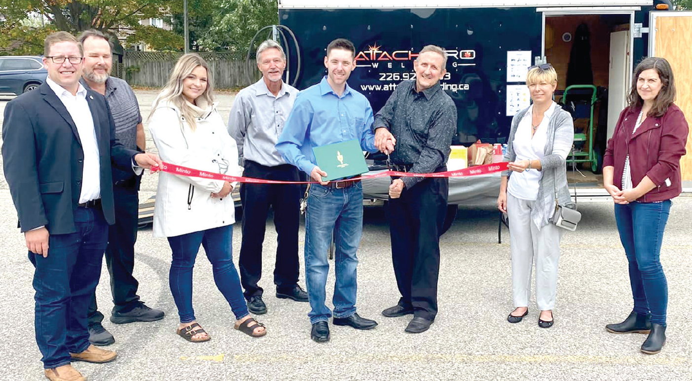 A grand opening was held on Oct. 14 for a new Minto-based business. Attatchpro Welding is a mobile welding service supporting construction, agricultural, landscaping and grounds maintenance operations. Local dignitaries, friends and family joined owner Tim Earnshaw at the opening. From left: Perth-Wellington MP John Nater, Saugeen Economic Development Corporation business community councillor Jamie Doherty, Sam Wylie, Mike Hergott, Earnshaw, Minto deputy mayor Dave Turton, Christine Groves and Minto Chamber of Commerce president Heather Watterworth. For more information go to www.attachprowelding.ca. Submitted photo