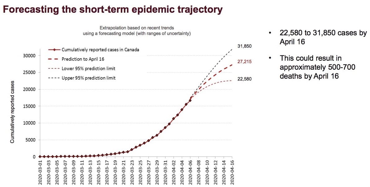 This forecasting shows there could be 22,580 to 31,850 COVID-19 cases by April 16 in Canada - and 500 to 700 deaths.