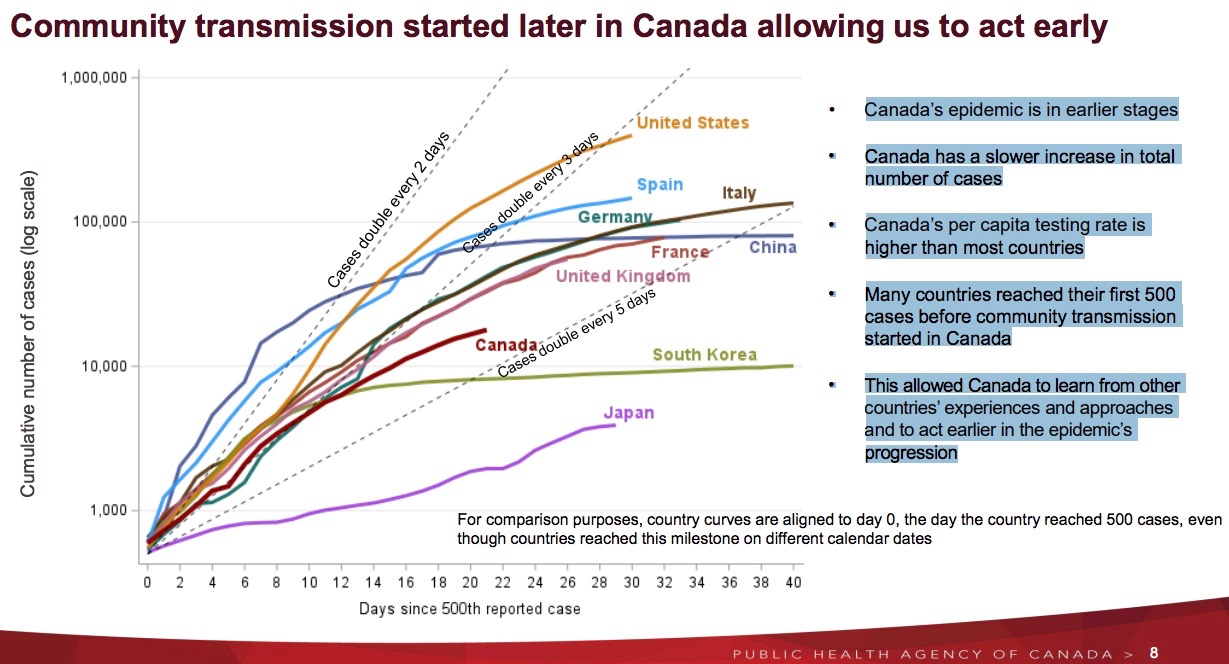 - many nations reached their first 500 cases before community transmission started here, which allowed Canada to learn from other countries’ experiences and approaches and to act earlier.
