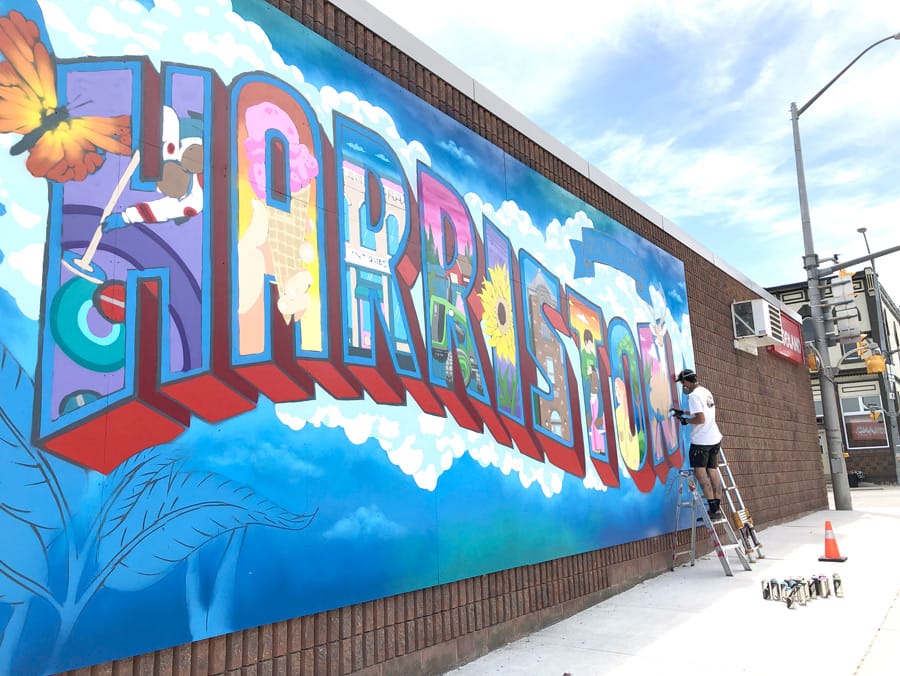 Splash of colour - Artist Blaze Wiradharma works on the first of two murals he will create on buildings in the Town of Minto this spring.