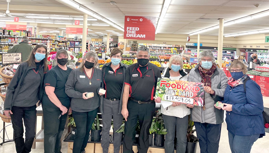 Foodbank donation – Mount Forest Foodland recently presented the Mount Forest Community Pantry with a $17,407 gift card. Foodland owners Kim and Luigi Catalano (third and fifth from left) and staff members presented the donation to Community Pantry volunteers, from right: Lee Nelson, Jan Harman and Shirley Wiltshire. Foodland officials say the funds were raised “thanks to the support of our customers and community” and “the hard work of all our cashiers.”