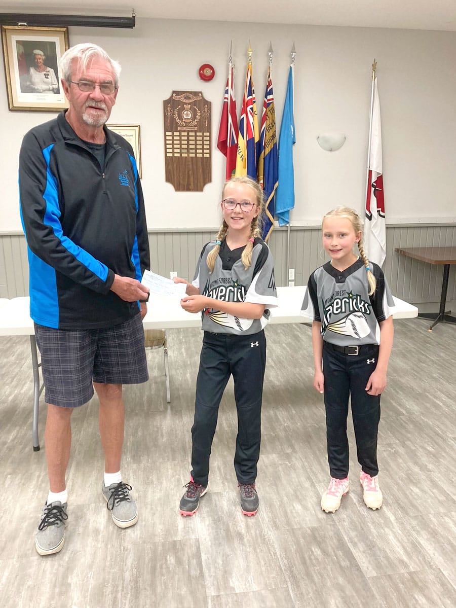 Minor ball contribution - Tim Noonan, chair of the Mount Forest Legion Catch the Ace Committee presented Keady and Mae, players with Mount Forest Mavericks Minor Ball, with a cheque for $1,000.