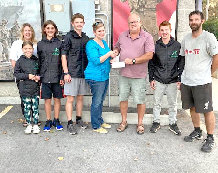 MOUNT FOREST – Mount Forest Legion Catch the Ace chair Don Koehler presents a $2,000 cheque from the lottery proceeds to Laurie Henderson, Chris, Alissa, Jacob, Noah, Reuben and Sommer Seddon for Mount Forest Ringette.
