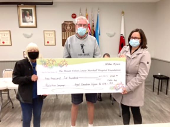 Mount Forest Legion Branch 134 recently presented donations to the local hospital foundation and Junior C hockey club. The LMHF donations were made on Oct. 18 in support of the foundation’s annual CKNX Radiothon campaign.