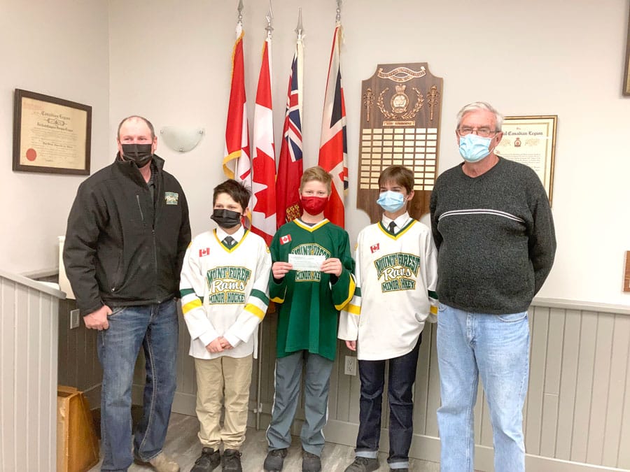 Legion donations - Mount Forest Legion Branch 134 president Ken Thompson recently presented a cheque for $2,000 to Mount Forest Minor Hockey President Anson Lewis. Also on hand to accept the cheques were three Ram players.