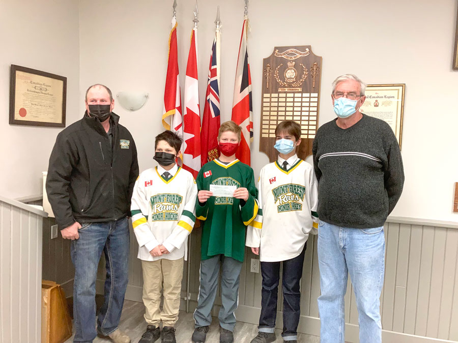 Legion donations – Mount Forest Legion Branch 134 president Ken Thompson recently presented a cheque for $2,000 to Mount Forest Minor Hockey President Anson Lewis. Also on hand to accept the cheques were three Ram players.