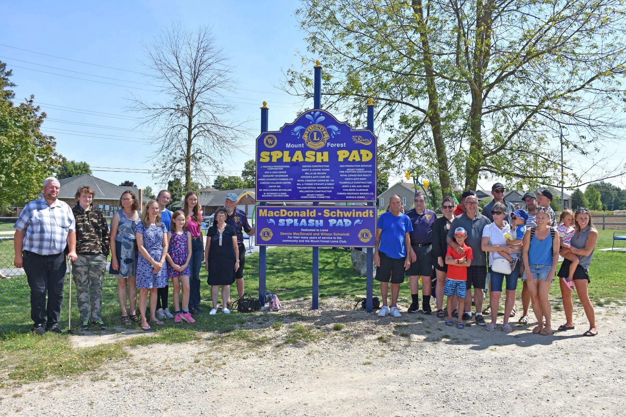Splash pad – Mount Forest Lions Club members Dennis MacDonald, left, and Wilson Schwindt, right, unveiled the new sign for the Mount Forest Splash Pad at a lions barbecue Aug. 20. The Splash Pad has been named the MacDonald- Schwindt Splash Pad in honour of these two long-time club members.