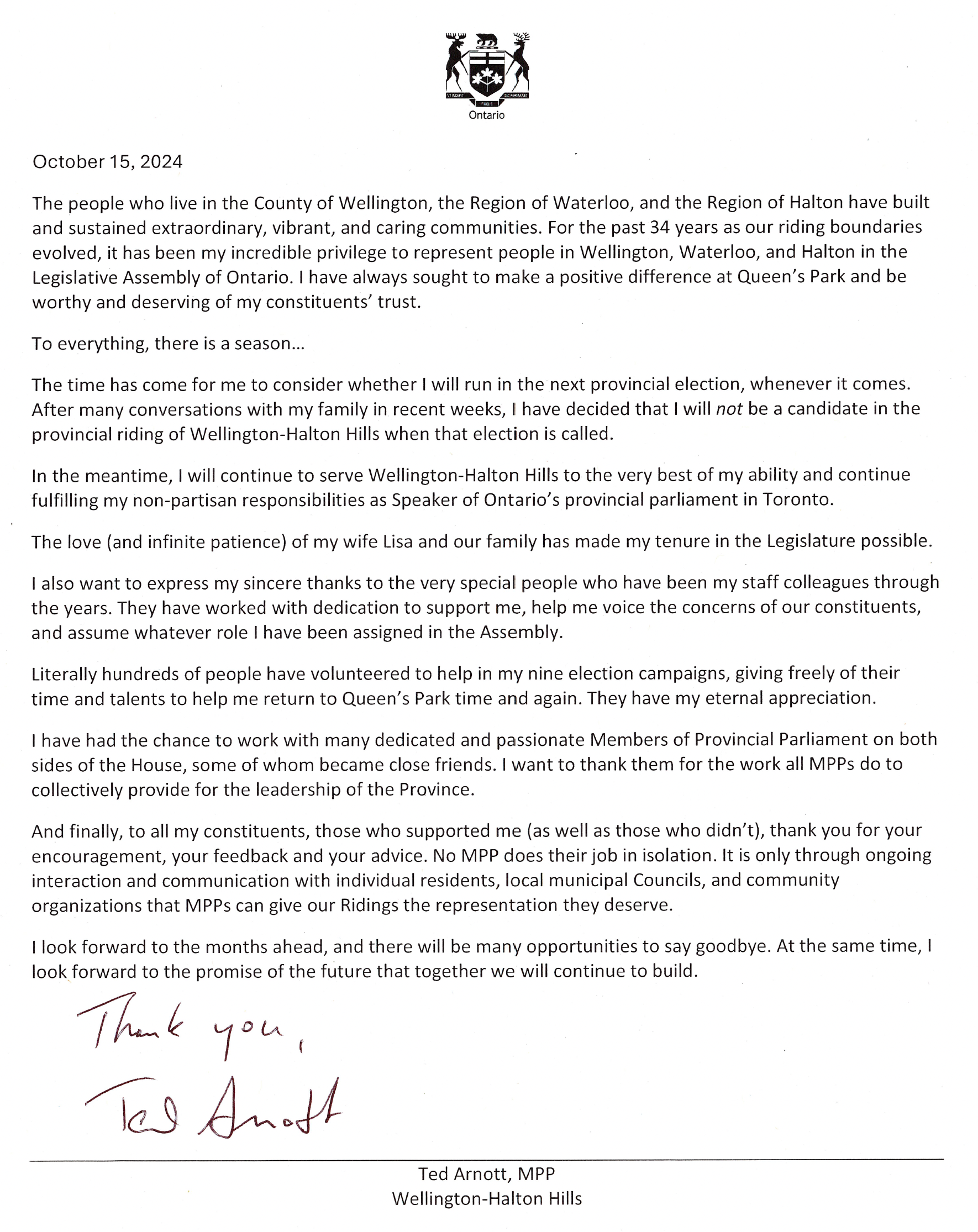 WELLINGTON COUNTY – Ted Arnott will not be running for re-election when the next provincial election is called.
