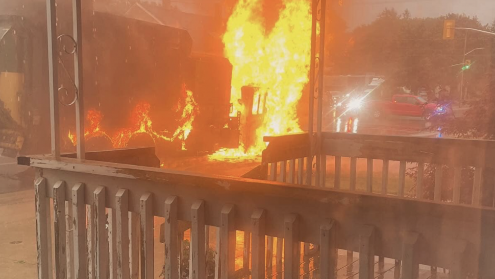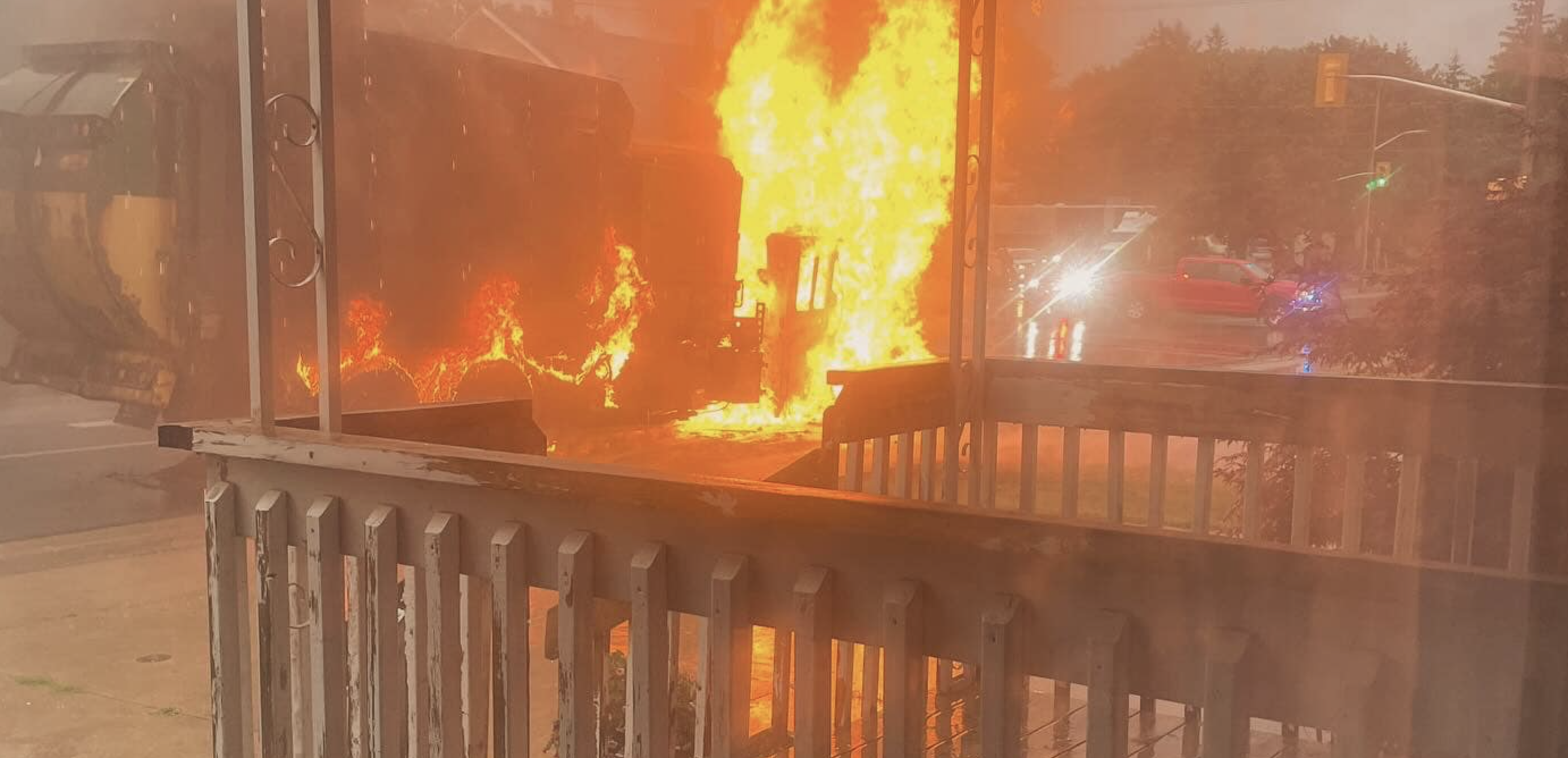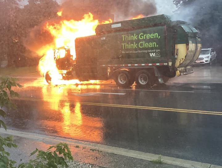 Photos and videos posted on Facebook show a Waste Management truck fully engulfed in flames, with fire billowing metres above and beside the truck while rain pours steadily.