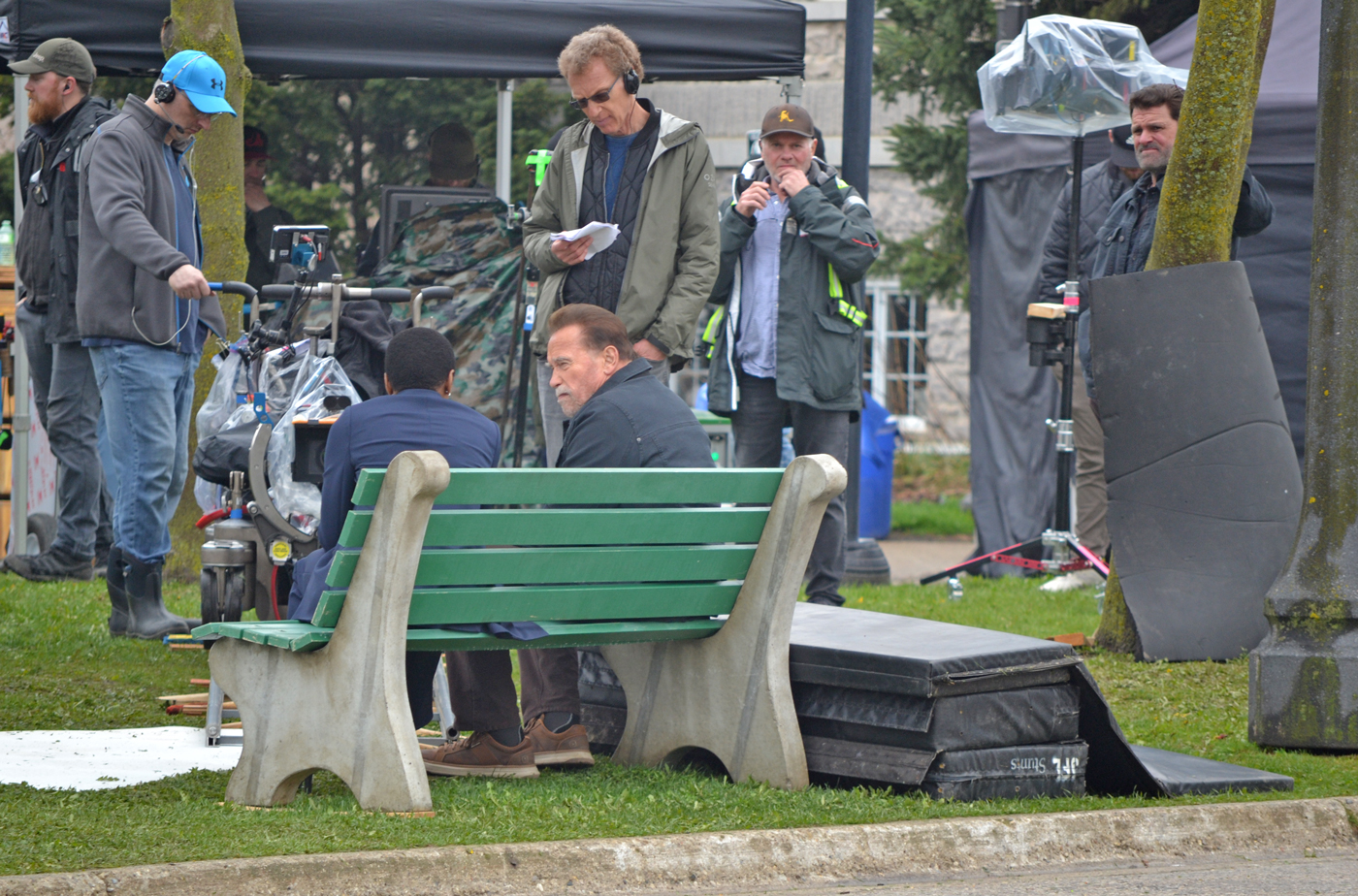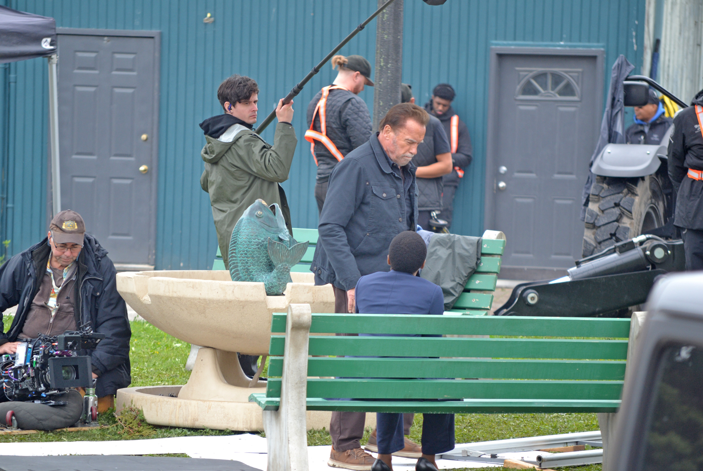 Rainy weather dampened the site on Tuesday morning, but skies cleared sufficiently by midday for filming to take place, and Schwarzenegger was part of the action.