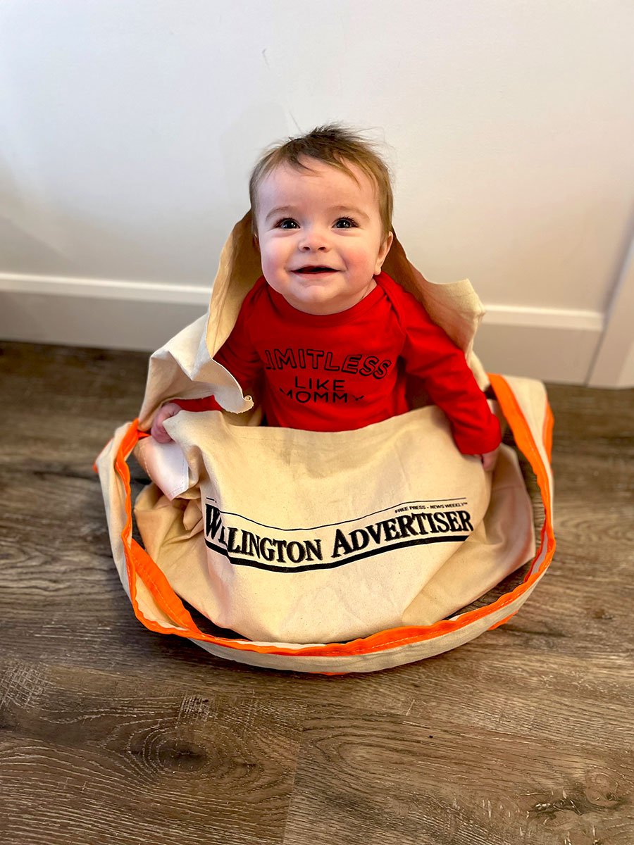 Carried or carrier? – Luca Gustafson explores a new Wellington Advertiser newspaper delivery bag. Mom Jordan Gustafson is a new carrier who will be delivering the newspaper and its sister publication, the North Wellington Community News, to doorsteps in Harriston.