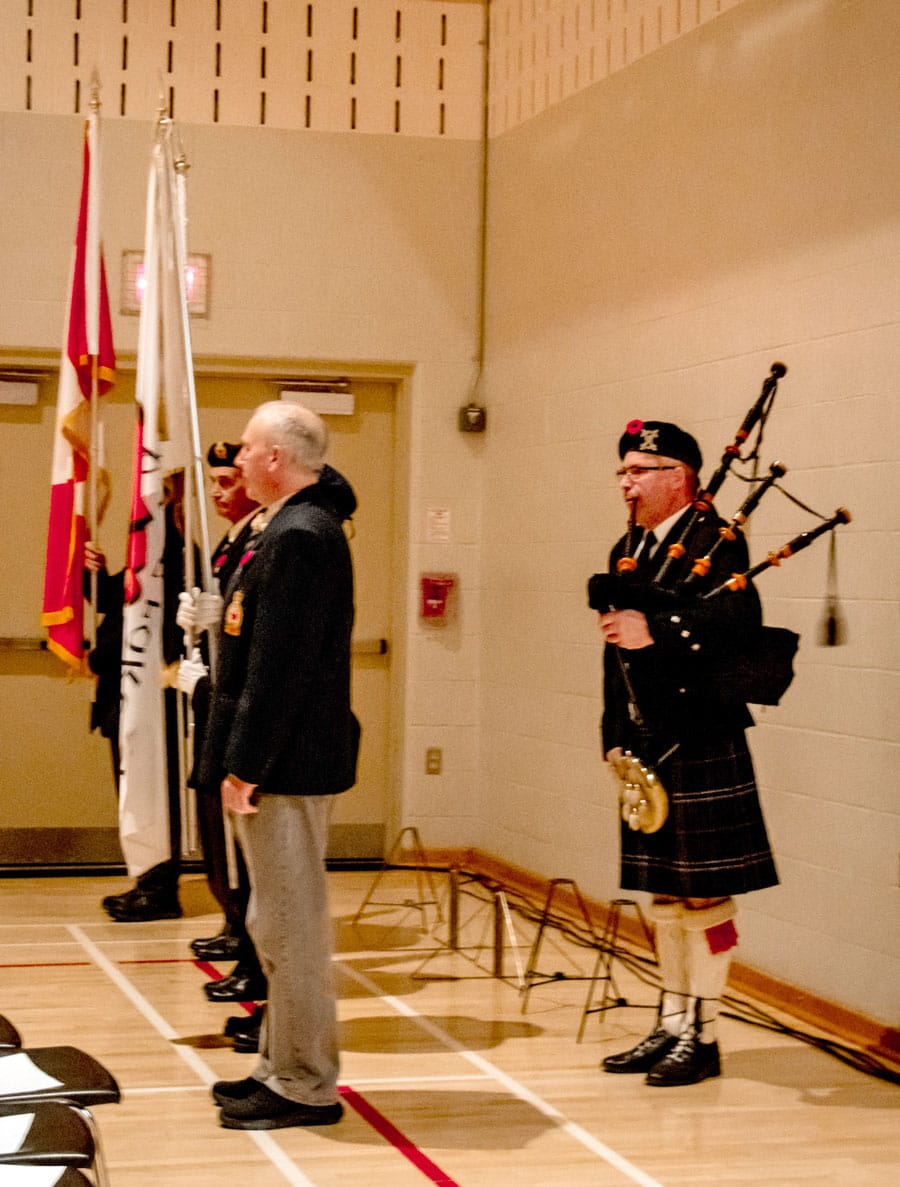 Teacher Robin Moore piped the colour party to and from the gym, along with local Legion members.