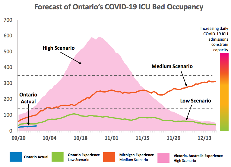 The low scenario, based on Ontario’s first wave but with a younger population affected, would see less than 100 people in ICU beds by November.
