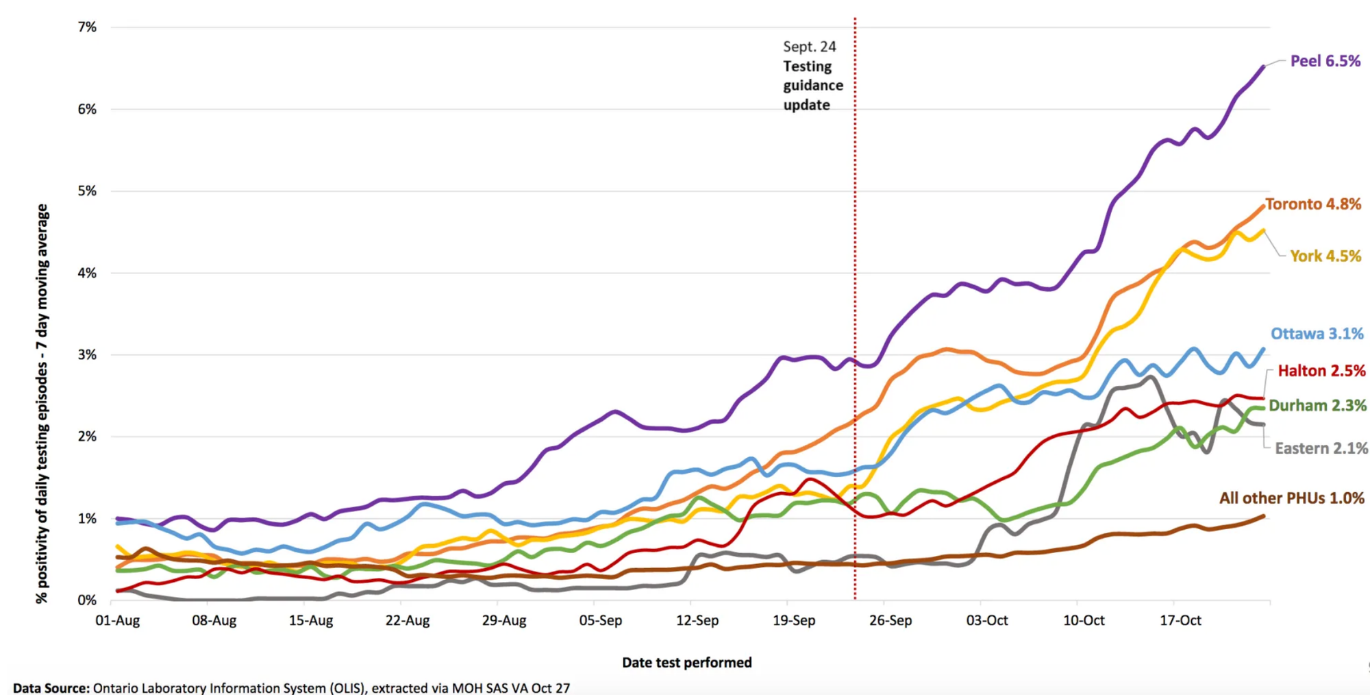 While hotspot areas like Peel and Toronto have positivity rates of 6.5 and 4.8 per cent respectively, most of the health units across the province – including Wellington-Dufferin-Guelph – have rates around one per cent.