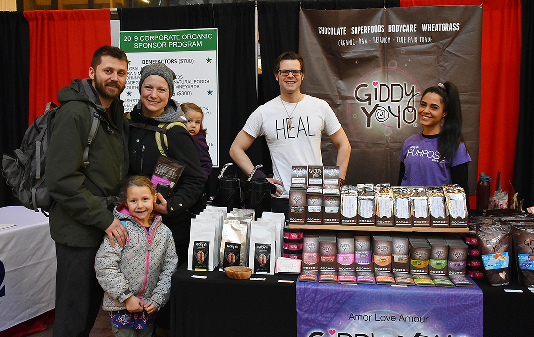 There were 147 display tables at the Guelph Organic Conference, Jan. 24 to 27 at the University of Guelph. Giddy YoYo from Orangeville specializes in raw, unroasted organic chocolate for chocolate bars, but has branched out into organic coffee and other organic foods. The Wheeler family from Elora bought some product, with Violet in front of dad Steve, mom Melissa and baby Everly, being served by Charlie Stokes and Marjan Mogharradi on the right. Photo by Bill Longshaw