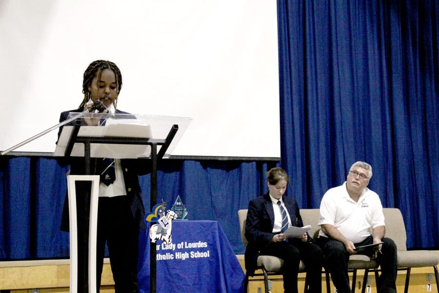 Our Lady of Lourdes student Azahel Selomon shared stories from Moore’s life, including his childhood on a farm, his varied career paths and challenges he faced along the way.