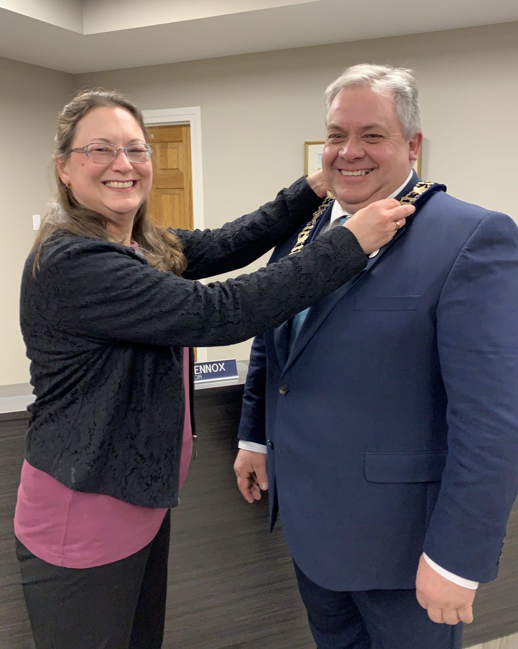 Following the singing of O Canada by Debbie Farrelly, clerk Karren Wallace and deputy clerk Cathy Conrad administered the declaration of office for Mayor Andy Lennox, with Conrad presenting the chain of office.